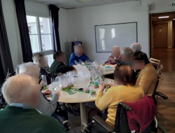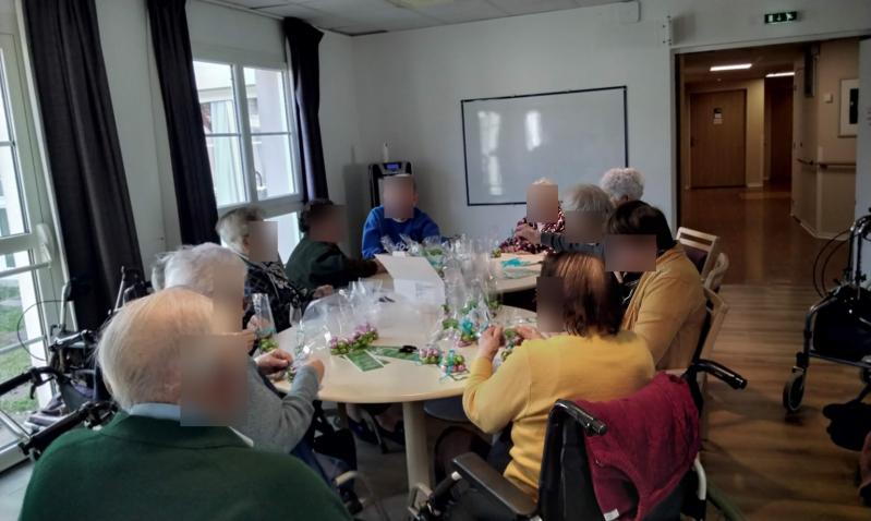 Certains résidents s’occupent du remplissage des sachets, d’autres de la décoration ou de l’assemblage, dans une ambiance chaleureuse.