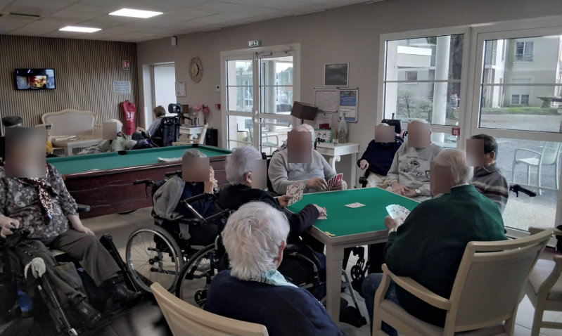 Dans un des salons communs de l’Ehpad, les cartes claquent doucement sur la table. Autour d’un tapis vert, quatre résidents sont concentrés, les yeux pétillants. La partie de belote vient de commencer, et avec elle un rituel qui rythme leurs après-midis.